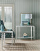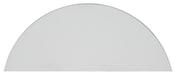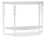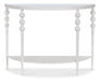 This half-moon console table offers soft sophistication with its white textured finish and beveled white-glass top. A single lower shelf enhances its utility, while the demilune shape makes it ideal for narrow spaces.