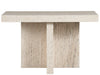 The Daxton Console Table stands out with its T-shaped silhouette, carved entirely from White Travertine. Its design is characterized by angular lines and sharp, cool edges, presenting a piece that exudes a minimalist yet bold aesthetic, perfectly suited for contemporary spaces that embrace clean, architectural forms.