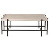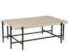 The Theron Cocktail Table artfully juxtaposes light and dark, featuring a serene, lighter Travertine rectangular top that gracefully contrasts with a clean-lined bronze metal base. This modern ensemble captivates with its visually appealing design, blending simplicity with a striking interplay of hues for a compelling centerpiece in any contemporary space.