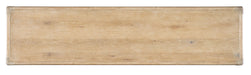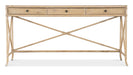 With the sublime vibe of an island oasis, the Retreat Pole Rattan Console is crafted of Oak and Maple Veneers in a Bamboo motif and accented by rope. X-design stretchers on the back and sides distinguish the piece, along with the sand-colored finish, transparent by design to showcase the unique patterns of the wood veneer. Featuring three self-closing drawers, the console is finished on all sides. Levelers included.