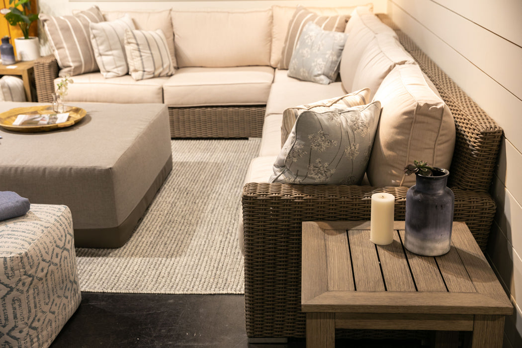 Sunset West's Coronado Sectional embodies casual sophistication, with transitional lines wrapped in a beautiful resin wicker in Driftwood. Outstanding comfort is provided with plush, fast drying cushions and generous seating proportions. - Fully welded powder coated aluminum frame - Virgin PE Resin Wicker in Driftwood finish - Stocked in Premium Sunbrella Fabric in Canvas Flax - Weather resistant, high-resiliency density cushions - Sunset West Progressive Springing System technology - Commercial Quality Construction Coronado is apart of the Driftwood color story, and coordinates well with Provence, Laguna, and pieces from the Bazaar.