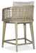 Create a calming resort-inspired retreat in your home with the laid-back, 35-inch high Surfrider Barrel Back Counter Stool. The appealing lattice design of the cane seat back combines with a loose back pillow and an upholstered seat covered in the Zuri Cream performance fabric to invite you to linger and relax. The legs, arms and footrest are finished in the light natural Driftwood finish, and the footrest has a Copper sheet for durability and an extra design detail.