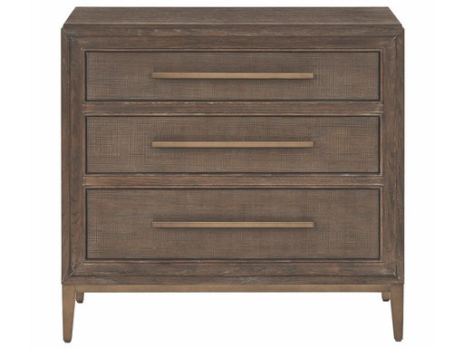 Universal FurnitureThe Montclair Nightstand showcases three drawers with signature Cocoa case and Embossed Cocoa fronts, elevated on a sleek Smoked Gold metal base. I...