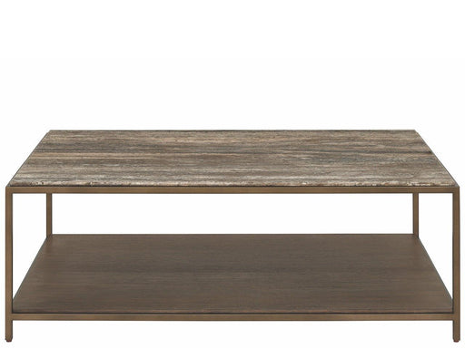 Universal FurnitureThe Brindle Table combines a striking Dark Gray Travertine stone top with a rich Cocoa wood shelf for material sophistication. The sleek Smoked Gol...