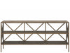 The Brindle Console Table makes a dramatic statement with an expansive Dark Gray Travertine top supported by an architectural Smoked Gold metal frame. Distinctive X-pattern bracing and two Cocoa wood shelves create a substantial presence perfect for entryways or behind seating areas.