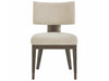 The Cocoa Side Chair features classical Klismos-inspired design with splayed legs and Smoked Gold metal ferrules. Upholstered back and seat in soft Silken Fog fabric create comfortable dining seating that works beautifully with coordinating tables.