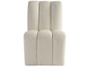 The Kylo Side Chair offers a bold reinterpretation of contemporary luxury, boasting a seat with pronounced tufting that creates a rich tapestry of deep ridges and sumptuous comfort. Clad in the sophisticated Canberra Ivory Fabric, the chair's design is accentuated by three elegantly upholstered vertical sections, each contributing to its visual allure. Mounted on sleek casters, it combines effortless mobility with a modern, refined aesthetic.
