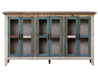 6 Glass Doors 73" Console. The Antique collection is meticulously crafted from solid pine wood, featuring a captivating hand-distressed look in a multicolor finish. This collection serves as the perfect rustic addition to your home.