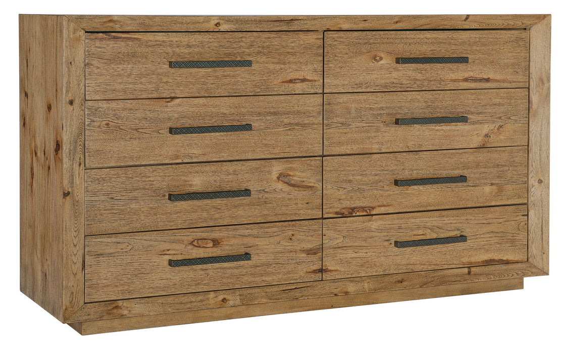 With a clean, simple silhouette, the Big Sky Eight-Drawer Dresser exudes the authenticity of the open spaces of the American wilderness. Crafted of Pecky Hickory Veneers and Cedar with a solid-wood edged top, the dresser is finished in the warm Vintage Natural. The drawers are self-closing and the top left has a removable felt liner, while the top right has a removable liner and felt jewelry tray. Both bottom drawers are cedar-lined.