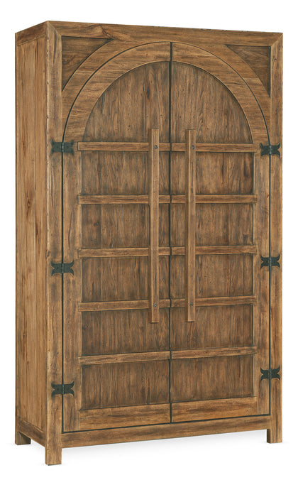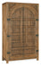 Inspired by the grandeur of wide open spaces in the American wilderness, the Big Sky Wardrobe exudes warmth with its rustic Pecky Hickory Veneers and Vintage Natural finish. The sweeping arched panel at the top of the case, authentic door hinges and wood bar hardware take you back to the heritage of post and beam construction and true craftsmanship. Behind the two doors is a removable clothes rod, two adjustable shelves and three drawers.