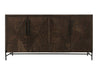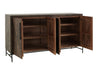 4 Door, Console. The Verona console combines sculptural elegance, making it a versatile addition to any space. Constructed with a solid mango wood frame and mortise-and-tenon joinery, it offers both strength and artisanal quality. The doors and top are made from engineered ash wood, featuring a bold geometric pattern that showcases the natural wood grain. In contrast, the slim metal base adds a contemporary touch. Custom metal pulls provide a subtle yet refined finishing detail. This console also features an innovative storage solution, complemented by four shelves designed for optimal organization and style.