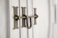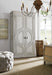 Exuding a sense of balance and serenity, the stylish focal point Bilzen Wardrobe has a stunning circle motif at the center. Design details include raised panel doors and distinctive latch-key hardware. The piece features a Whitewash finish with a beautiful Merion Blue interior. Behind two full length doors is a full length mirror on the back of the left door and six drawers, two adjustable wood shelves, four removable dividers and a clothing rod.
