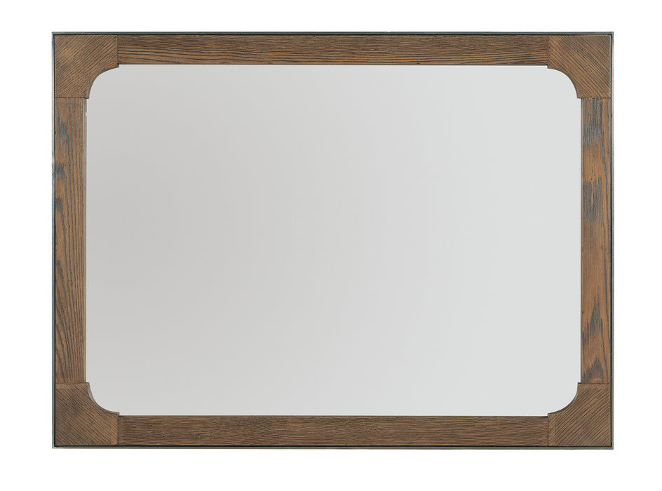 In an updated Craftsman style, the Chapman rectangle-shaped mirror has a casual warm brown finish over White Oak with a hand-hammered forged pewter metal insert around the frame.