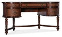 Inspired by the tropical craftsmanship of the West Indies and classic British and Dutch Colonial design periods, the Charleston Writing Desk has a timeless kidney shape, stretchers, rattan drawer fronts, intricately-carved leaf motifs on the legs and a robus leather writing surface top. Crafted of Cherry Veneers, Rattan and Resin, it is finished in the deep, rich Maraschino Cherry. There are five drawers. The left and right top drawers have one removable partition, one writing slide and pencil tray for use in either drawer. The center drawer has a drop-front for keyboard use. Antique bronze round knobs and ring-pull hardware add the finishing touch.