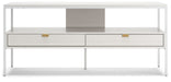 Bring your vision of a modern living room to life with this sleekly designed TV stand. Its linear construction and white finish keep things minimal. An open shelf and two drawers allow you to store in simply streamlined style, rounding out this versatile, striking piece.