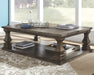 Homey. Hearty. Heavenly hued. Luring with a distressed weathered gray finish and square baluster legs set on a broad lower shelf for great presence, this coffee table is sure to make your homestead feel that much more like home. The look is beautified with elm veneers and a framed and plank-effect tabletop for a richly crafted masterpiece made for years of satisfaction.