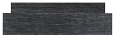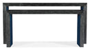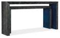 Rustic and modern with a chic flair, the Halen Nesting Sofa Tables have a clean and simple silhouette. Crafted of Pine and Maple Veneers, the exterior is finished in black, with a blue painted finish on the inside legs. Both tables are 14 inches deep, and the smaller table fits underneath the larger one.