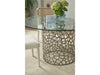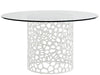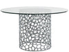 The Coral Dining Table features a round glass top supported by a coral-inspired cast aluminum base. This dining table's transparent top enhances the sculptural base creating a statement piece that embodies coastal elegance.