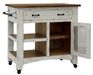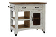 1 Drawer 1 Mesh Door Kitchen Island. Introducing our Pueblo White collection, crafted from solid pine wood. This rustic collection is the perfect addition to bring your dream space to life. It features a hand-distressed finish in white and brown on the tops.