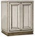 Light-catching and sparkly, this two-door, two-shelf mirrored nightstand will infuse your room with beauty and calm. Finished in Visage, an alluring patina of silver greige with amber glaze.