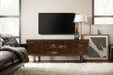 Crafted of Elm and Poplar Veneers with an antique bronze metal base, the Solstice Entertainment Center has a sophisticated primitive style. There’s one adjustable, ventilated wood shelf behind the center pair of doors and one adjustable ventilated wood shelf behind each of the outside doors and a ventilated back panel in all sections. Contrasting a medium wood finish with a dark gray top, the Solstice accommodates up to an 80-inch TV.