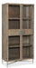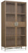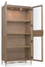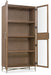 The Sonnet Display Cabinet offers a stylistically versatile, functional piece that blends natural textures with a refined minimalist silhouette. Crafted of Quartered and Cathedral-Cut White Oak Veneers in a light earthen finish with complementary woven cane back panels, the cabinet has tapered metal legs and stretchers and two satin-finished champagne-colored semi-circle pulls that fit together in the center of the piece. The two wood-framed doors have tempered glass. Behind the doors are two lights with a 3-intensity touch-switch located on the right side of the back panel. The top and bottom shelves are adjustable wood-framed tempered glass shelves.