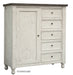 5 Drawer 1 Door Gentleman Chest. Exuding farmhouse chic with just the right touch of old-world charm, the Stone Collection is meticulously crafted from solid pine wood. The wood is lightly distressed, showcasing a white finish and complemented by weathered gray tops.