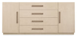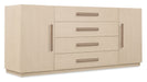 The Westwood Buffet offers understated luxury with practical storage. Featuring four center drawers, two doors with adjustable shelves, and a silverware tray, this buffet is ideal for organizing your dining essentials. The Polished Limestone finish on quartered oak veneers, along with custom bar hardware, brings modern elegance to any dining room. Perfect for those who value both style and functionality.